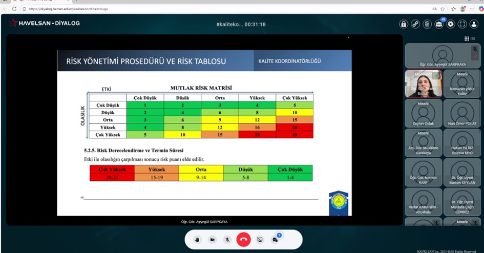 HAVELSAN Diyalog platformu üzerinden gerçekleştirilen toplantıya, Rektör Yardımcısı Prof. Dr. Nihat Denek'in katılımı ile akademik ve idari birimlerde görevli kalite elçileri katıldı. Eğitimde, birimlerdeki risklerin etkin bir biçimde tanımlanması, değerlendirilmesi, izlenmesi ve raporlanmasına yönelik bilgiler aktarıldı.