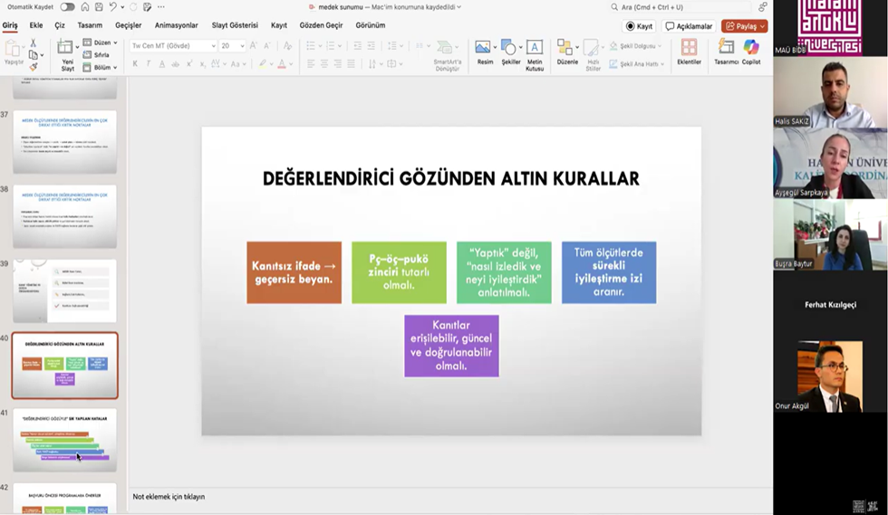 Üniversitemiz Kalite Koordinatörü Dr. Öğr. Üyesi Ayşegül Sarpkaya tarafından, Mardin Artuklu Üniversitesi’ne Akran değerlendirmesi kapsamında “MEDEK Süreçleri” konulu çevrim içi bir eğitim düzenlendi.